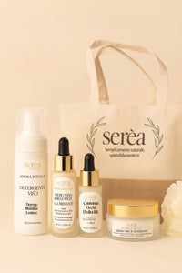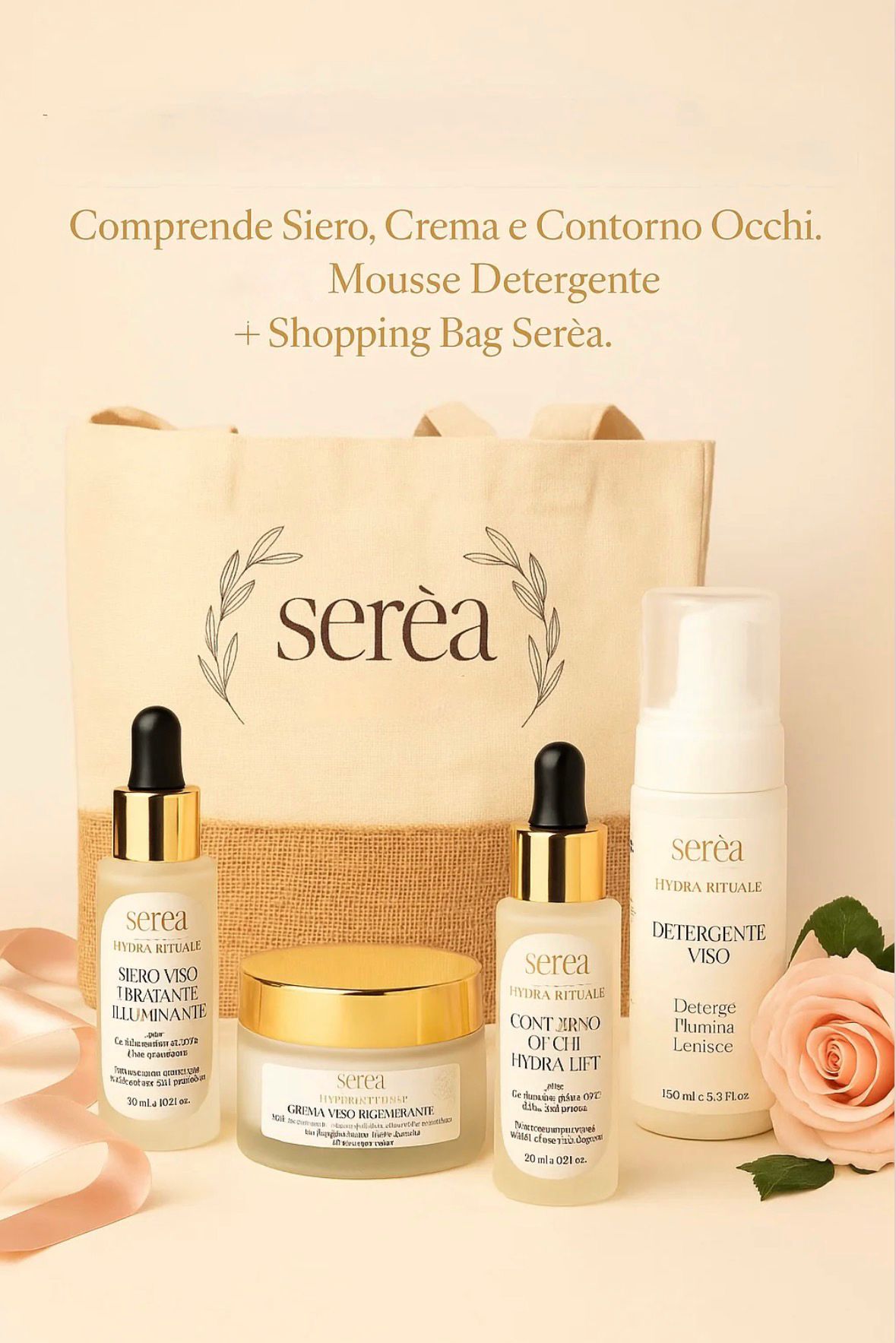 Il Kit Hydra Rituale racchiude i quattro trattamenti essenziali per la cura quotidiana della pelle:Mousse Detergente,Siero Viso,Crema Viso e Contorno Occhi, insieme alla Shopping Bag Serèa in omaggio e spedizione gratuita.