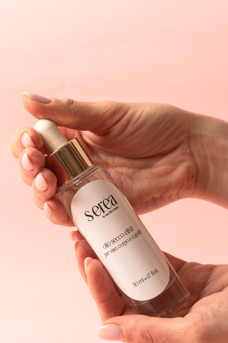 Serèa Elixir è un olio secco multifunzione naturale, formulato con una combinazione di oli vegetali pregiati e attivi lenitivi. È ideale per nutrire, idratare e proteggere pelle e capelli.